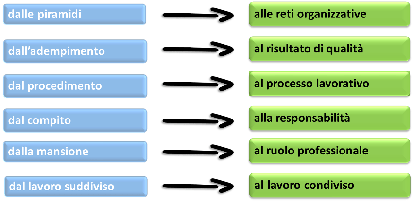 In particolare, alle organizzazioni come piramidi subentrano le reti organizzative, al semplice adempimento il risultato di qualità, ai procedimenti la rilevanza dei processi lavorativi, ai compiti assegnati le responsabilità, alle mansioni il ruolo e la professione.